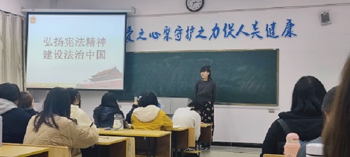 为弘扬宪法精神,提高法律意识,推进“法治校园”建设,在第八个国家宪法日来临之际,医学院11月30日晚,在汉风A楼413、415教室举办了国家宪法日主题教育活动,2021级学生参加本次活动,活动由学院团总支书记刘小夏主持。