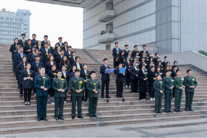 外国语学院充分发挥学生群体中思政教育元素,组织退伍大学生士兵积极发挥朋辈教育作用。12月13日清晨,来自2021级专升本班的7名退伍同学退伍不褪色,保持军人本色,身着常服,迎着朝阳,在学生宿舍楼前,脱帽肃立,为南京大屠杀死难者默哀,誓言以吾辈之青春,护华夏之盛世。