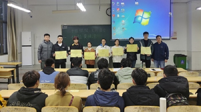 石有武、刘安国为荣获校级十佳班级和文明宿舍学生代表颁发荣誉证书。