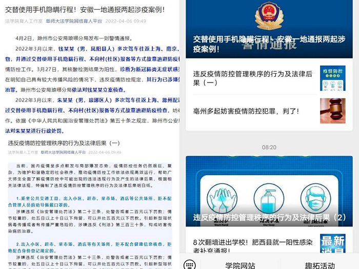 助力战“疫”,运用新媒体开展科普、普法宣传,提升学生法治意识。法学院分团委在微信公众号设立了疫情防控专栏,通过专栏向广大师生宣传疫情防控政策、疫情防控知识及法治宣传知识等。引导广大师生在增强自我防护意识和能力的同时,提升法治意识、遵守相关法律法规,自觉配合和引导他人自觉配合有关部门做好疫情防控工作,做到不信谣、不传谣,助力战“疫”,积极为打赢这次疫情防控阻击战而努力。