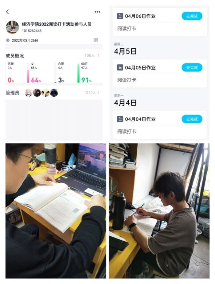 为营造书香校园,打造人文经院,增加学生阅读积累,营造浓厚学习氛围,经济学院开展阅读打卡活动,鼓励并引导学生在校防疫期间以书为伴,用阅读来丰富自己的课外生活。同学们踊跃报名参与,每天在打卡群里分享自己的阅读故事,并举行读书交流会,互相学习、共同进步。阅读打卡活动不仅充实了学生的课余活动,还培养了学生的阅读习惯,激发读书热情,展现了经济学院广大学子积极向上的心态与良好的学习氛围。