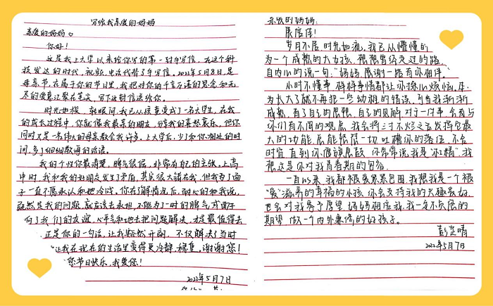 一封亲笔信,温暖传亲情。学生用细腻的笔触描绘了母亲的辛勤付出,表达了对母亲的由衷敬爱。“小时候总感觉说爱您很难,现在只想赖在您身边对您说千万遍;小时候总想着仗剑天涯,现在却只想赖在您的身边,细数年华。”一段段文字、一封封云端书信注入了学生们绵绵的深情,展示着与母亲的点点滴滴甜蜜回忆,表达着对母亲的节日祝福,传递着对母亲的爱与感恩。