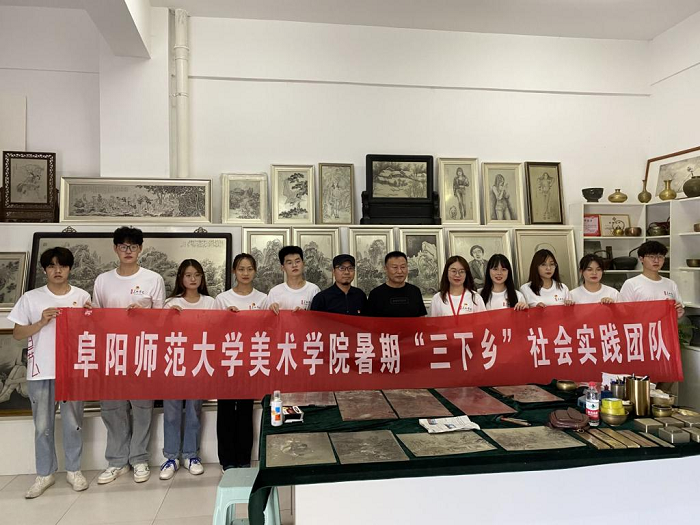 为深入学习宣传贯彻习近平新时代中国特色社会主义思想,贯彻落实习近平总书记关于青年工作的重要论述,引导和帮助广大青年学生上好与现实相结合的“大思政课”,在社会课堂中受教育、长才干、作贡献,努力成为担当民族复兴大任的时代新人,以实际行动传承民族传统文化,增强学生的专业认同感、责任感、使命感,美术学院结合专业特点,组织学生志愿者团队“红色艺工队”于6月15日-16日前往国家级非物质文化遗产-阜阳杜氏刻铜工作中心进行调研,开展暑期“三下乡”社会实践活动,本次实践活动由美术学院党委副书记李向兵,学院团委负责人程娅带队指导。