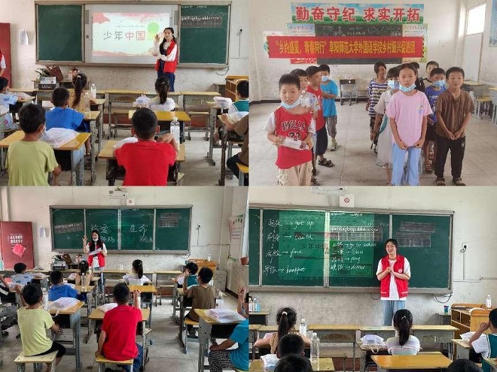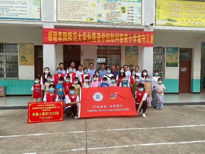 关爱留守儿童,助力基础教育。在窑前小学举办的活动启动仪式上,戴亮介绍了阜阳师范大学和外国语学院的总体情况,阐述了此次暑期“三下乡”活动的内容和目的,强调了活动的纪律和要求,希望学生志愿者们通过良好的活动效果在社会课堂中“受教育、长才干、作贡献”。亓东和朱金龙介绍了袁集镇和窑前小学教育现状,希望加强与阜阳师范大学和外国语学院的交流,更好地促进基础教育发展。戴亮代表外国语学院向窑前小学捐赠了教育图书3套和价值1500元的文具。