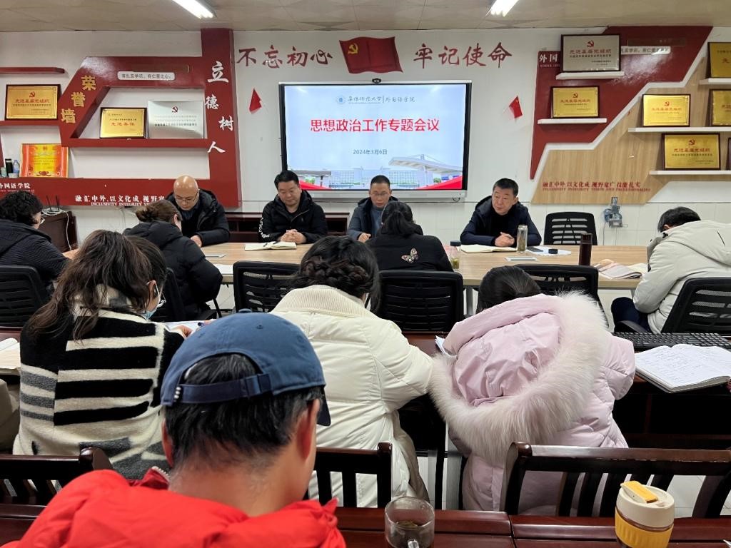 为深入学习教育部、省教育厅关于新时代学生思想政治工作最新文件精神,研究部署学院落实举措,扎实推进学校第五轮巡察反馈问题整改,3月6日,外国语学院在景行楼816会议室召开专题思想政治工作会议,进一步强化对思想政治工作的重视和研究,提升思政工作的针对性和实效性。学院领导班子、系部主任、行政人员、辅导员和班主任参加会议。会议由党委书记刘张飞主持。