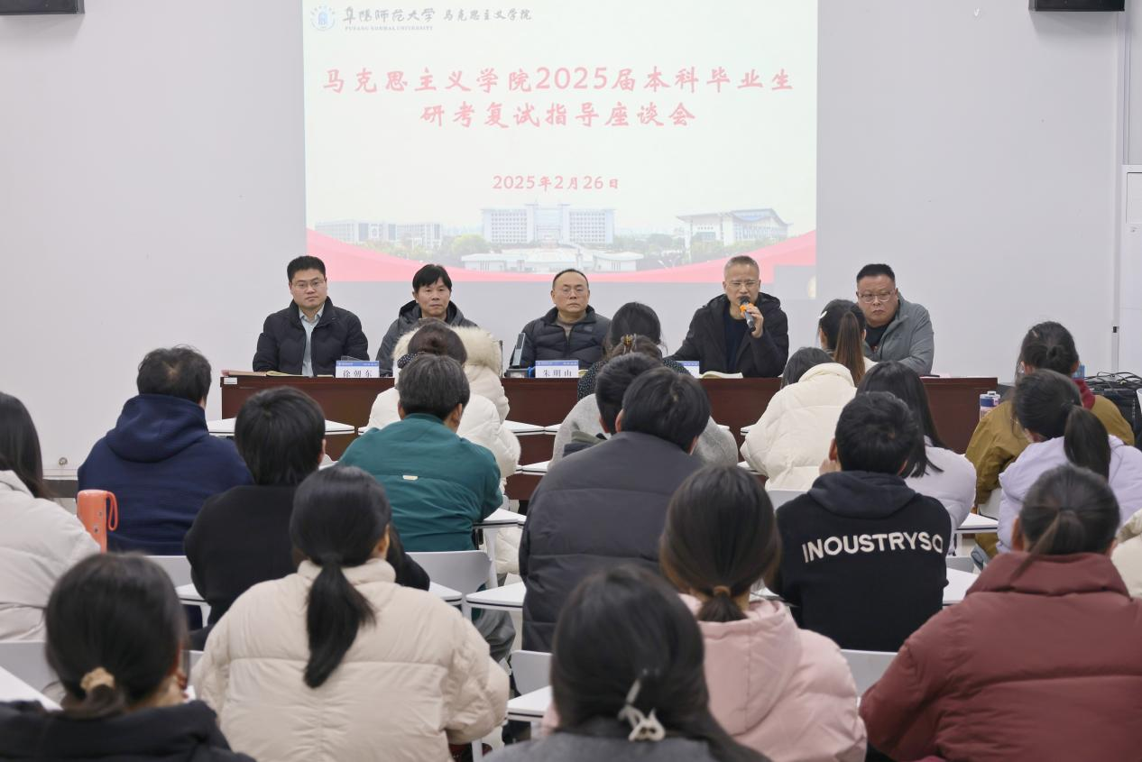 为推进大学生高质量充分就业,进一步提升马克思主义学院考研学子的复试成功率,推动学院考研工作取得新的突破。2月26日,在学院201会议室召开2025届本科毕业生研考复试指导座谈会,学院党委书记朱明山、院长朱宗友、副院长夏小华、党委副书记徐朝东及考研初试达线同学参加,会议由徐朝东主持。