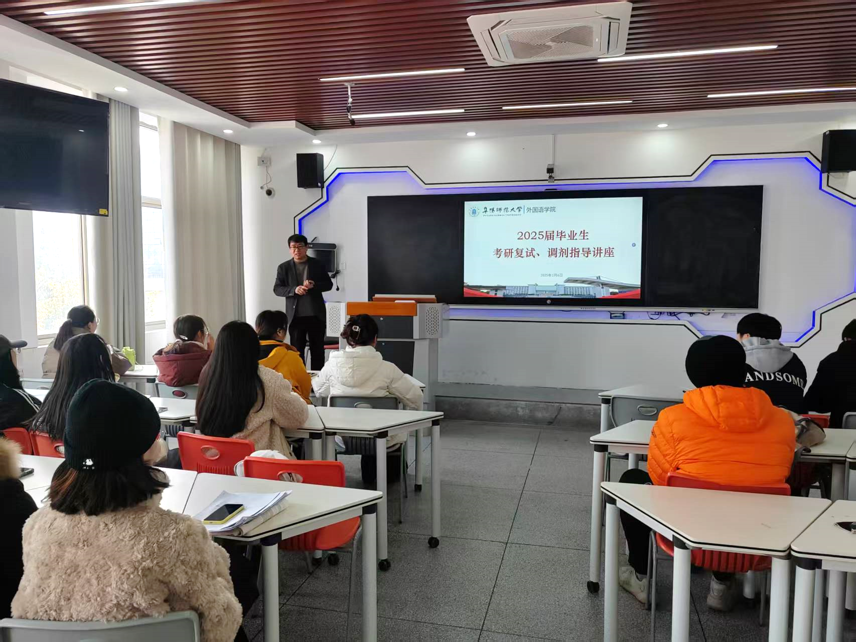 为扎实推进2025届毕业生考研升学工作,全面提升考研学子复试成功率,3月6日,外国语学院邀请阜阳海文考研校长郑立明在景行楼304举办考研复试指导讲座。学院毕业班辅导员及全体2025届考研初试上线同学参加。