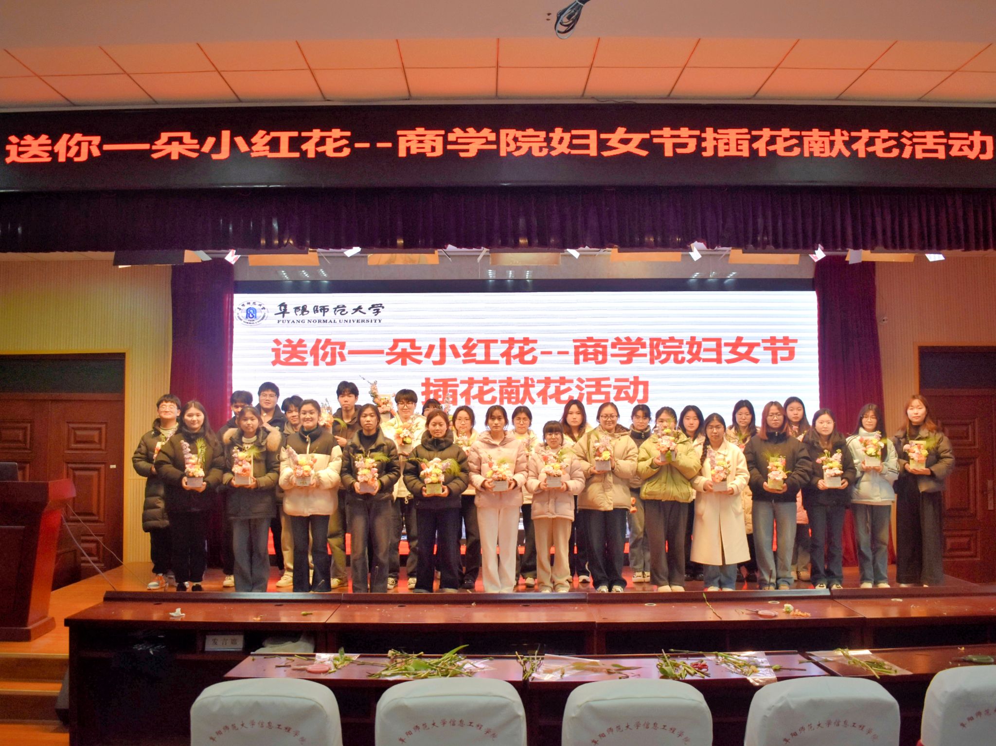 为进一步拓宽学生美育和劳育的教育渠道,积极营造知恩感恩的文化氛围,在2025年“三八”国际劳动妇女节来临之际,商学院组织学生开展插花并向女教师献花活动。