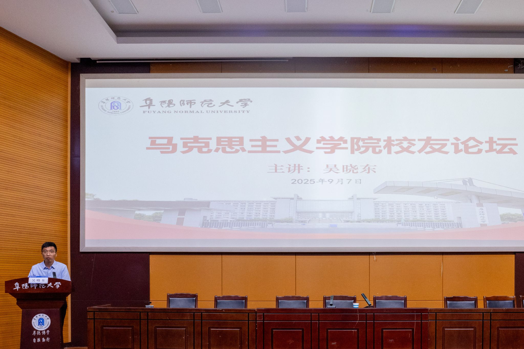为切实增强2025级新生专业归属感与认同感,引导其尽快适应大学学习生活、明确成长方向,9月7日,马克思主义学院在西湖校区F楼报告厅举办新学期第一季校友论坛。2004届思想政治教育专业优秀校友,阜阳一中颍上分校党委副书记、副校长吴晓东应邀担任主讲嘉宾,为全院新生作专题报告。报告会由学院党委副书记徐朝东主持。