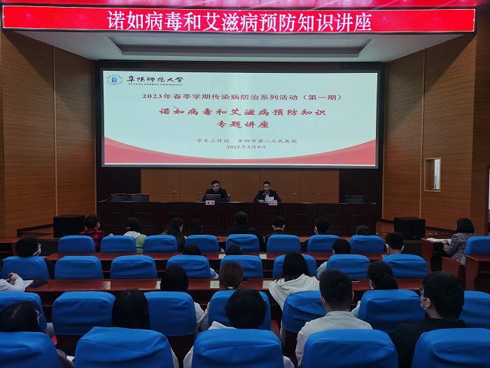 本次活动分为传染病防治知识讲座、现场义诊、知识宣讲和宣传材料发放等。在传染病防治知识讲座环节,阜阳市第二人民医院感染科主任医师黄宇以图文并茂的形式从诺如病毒的流行趋势、临床特征、诊治方式与预防控制措施等方面,深入浅出地对诺如病毒防治知识进行了详细讲解,引导同学们科学认识诺如病毒。随后,黄宇结合典型案例重点介绍了当前艾滋病的流行形势、致病原理、临床表现、传播途径及预防措施,提醒同学们洁身自好、抵抗诱惑,积极培养文明、健康的生活方式。