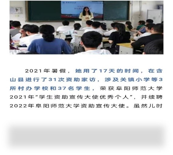 在阜阳师范大学新闻学专业学习是我的幸运,感谢专业性的新闻教育所赋予我的理性思考,我清楚地知道这份幸运的背后是来自党和国家给予我的支持和帮助。在校期间,我发表了涉及志愿资助文章20余篇,总阅读量10000+,以榜样形象讲好资助故事。我将矢志不渝宣传好党和国家的政策,做好党和人民的耳目喉舌,让青春在祖国需要的地方绽放。