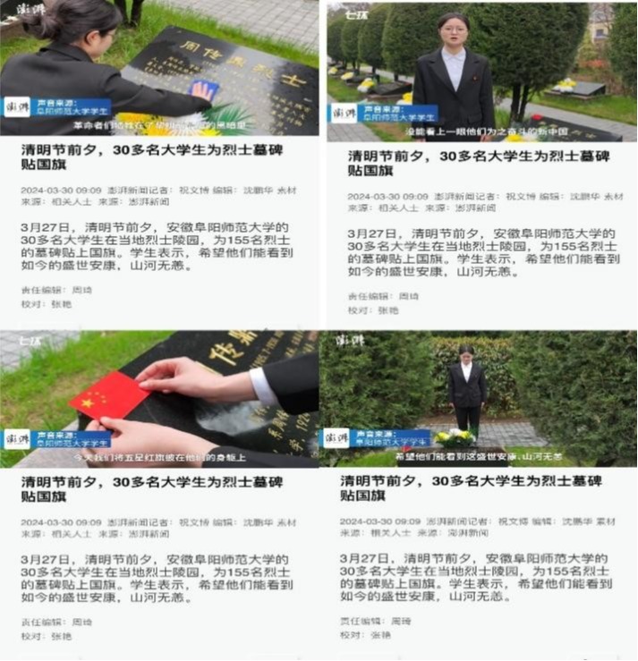2024年清明,我再次来到阜阳烈士馆,为烈士墓碑贴上国旗,还记得我被记者采访时的情景:“革命先烈牺牲在黎明前的黑暗里,没能看上他们为之奋斗的新中国,今天我们将五星红旗贴在他们的墓碑上,希望他们看到今天的祖国盛世安康、山河无恙。”