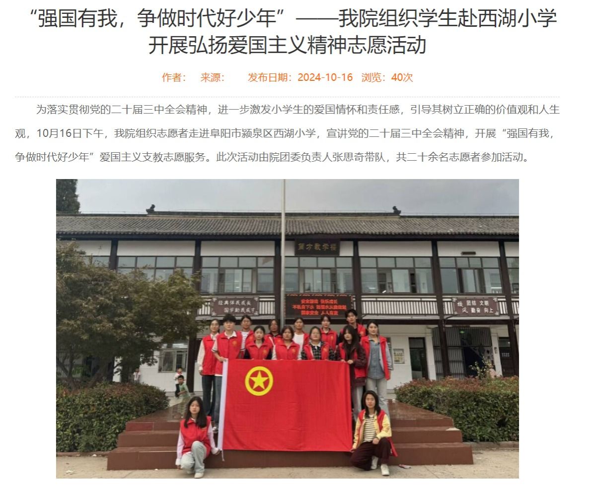 我作为团委兼职副书记,经常带队到阜阳市中小学开展各种爱国主义支教活动,将自己的所学尽可能传授给学弟学妹们。