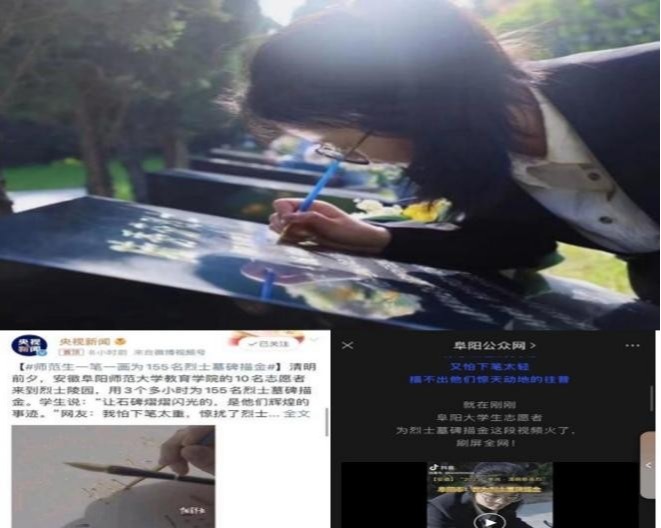 2023年清明,教育学院联合阜阳市革命烈士纪念馆开展“我为烈士墓碑描金”活动,我作为志愿者对墓区烈士墓碑进行了清扫,对字迹脱落的墓碑重新描金,用实际行动表达对先烈的缅怀和敬意,使得烈士墓碑焕然一新,这项活动也被央视新闻、安徽共青团、阜阳公众网等十多家媒体报道。