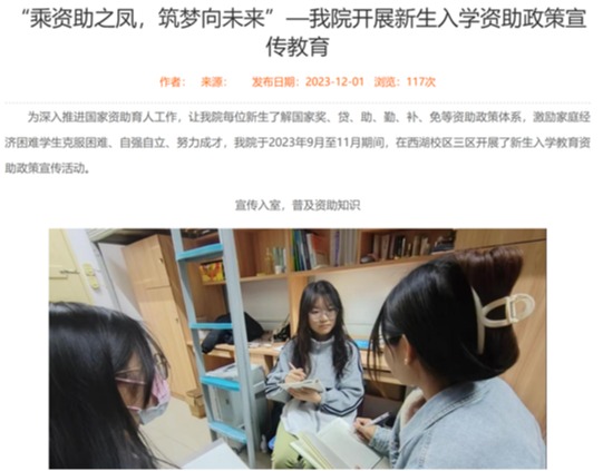 为了让学院每位新生更好地了解奖、助、勤、贷、补、减、免及绿色通道等资助保障体系,我和学院其他资助助理成员在线上开展新生资助政策答疑专场,线下开展“进宿舍”“进班级”等资助政策宣传活动,同时作为国家励志奖学金获得者,在班级里开展励志主题班会,获得了较高反响。