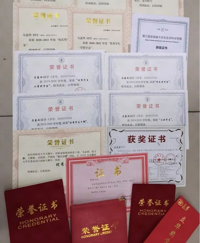 马孟雨,中共党员,阜阳师范大学生物与食品工程学院2018级食品质量与安全专业1班。国家奖学金、校长奖学金、校优秀学生一等奖学金、二等奖学金获得者,多次获得“三好学生”“三好学生标兵”“优秀学生干部”等荣誉称号。曾获得安徽省第三届大学生生命科学竞赛二等奖、第十四届全国大学生作文大赛三等奖等荣誉。