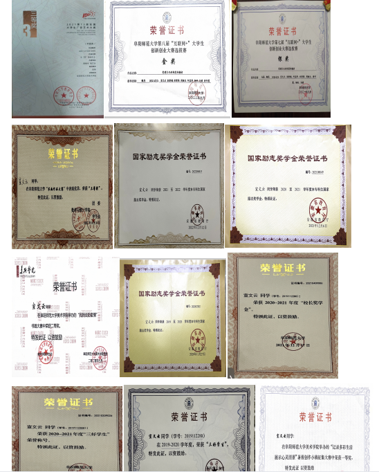 1.2019-2020学年:荣获一等奖学金、国家励志奖学金和“三好学生”荣誉称号;荣获第十五届全国大学生文学作品大赛三等奖;