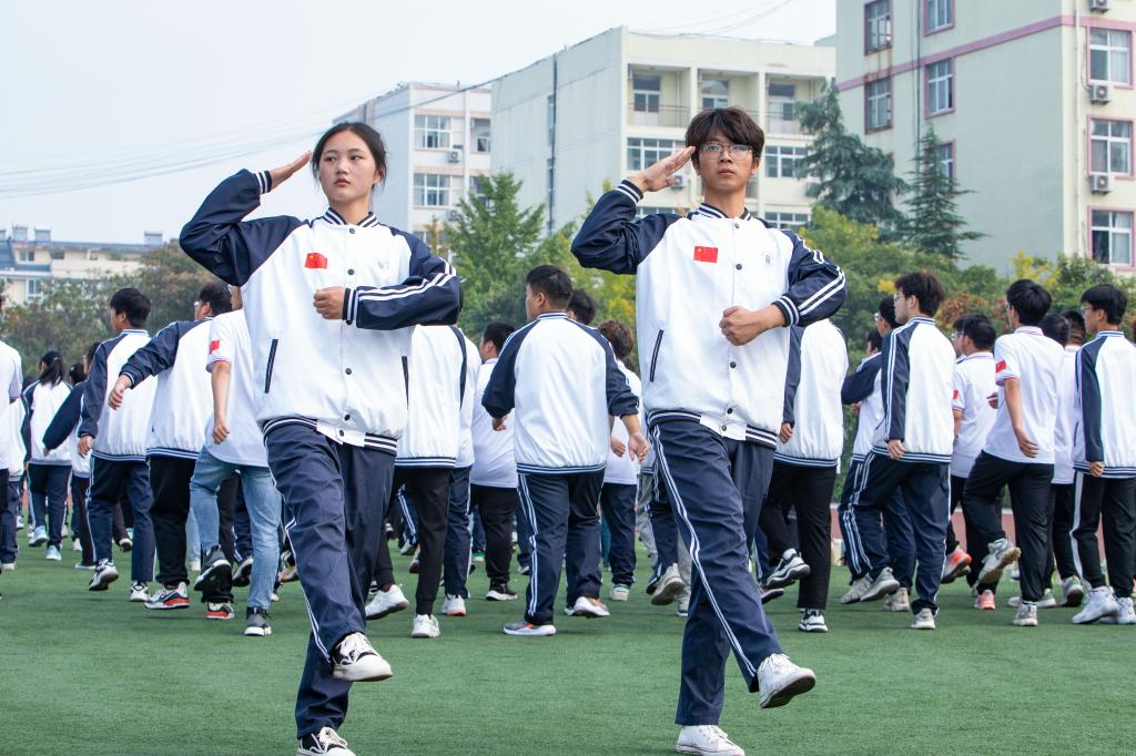 青春气贯如虹,勇锐盖过怯懦。稍息、蹲下、摆臂、向左向右转、敬礼……几个动词,貌似简单,它考验个人身体的协调能力,考验团队的配合能力。团结就是力量,在一令一动,一令三动的重复练习下,同学们越来越整齐划一。摆臂适度,敬礼迅速,正步声音整齐响亮,踢出激昂,走出坚定,踏出对祖国深沉的爱,一阵齐过一阵的脚步声,熔铸青春最嘹亮的合唱乐。