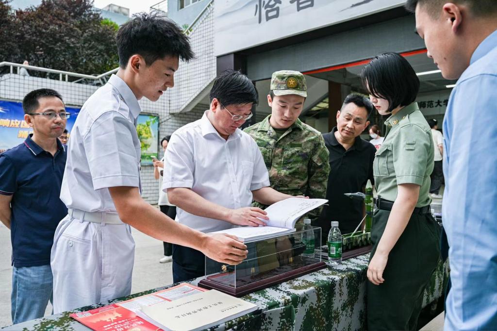 为扎实做好2024年下半年征兵宣传动员工作,进一步增强学生国防意识,弘扬爱国主义精神,激发广大青年应征入伍参军报国热情,学生处(党委学工部、武装部)自5月中旬起,连续两周同步在清河校区、西湖校区和三里桥校园广泛开展大学生国防教育与“征兵工作宣传月”主题活动。校党委书记程曦于6月4日下午到宣传活动现场指导工作。本轮征兵宣传活动由学校征兵工作站负责组织策划,大学生军事类兴趣社团“八一社”的退役大学生具体实施。