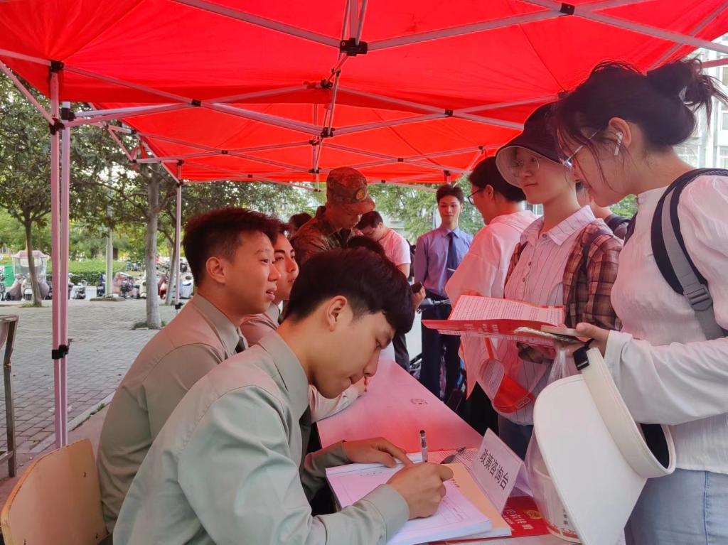 活动现场布置了醒目的宣传海报、专业化的咨询台、逼真的军事模型和内容详实的宣传展板,吸引了众多大学生的目光。“八一社”的退役大学生们身着军装,化身宣传大使,现场向大学生发放了宣传材料,向前来咨询的大学生分享自己的军旅经历,耐心细致地解答同学们对征兵政策的各种疑问,并从入伍条件、报名流程、优待政策等方面,向有入伍意向的大学生进行了宣传动员,为同学们提供了一站式咨询服务。