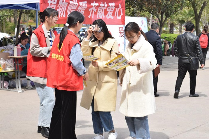 该院青年志愿者向过往同学分发肺结核病宣传手册、宣传单,讲解肺结核表现特征和国家相关治疗政策。