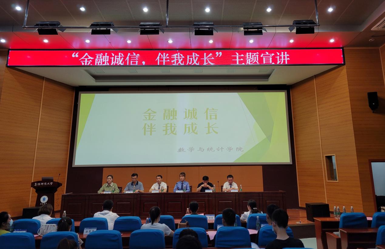 弘扬诚信精神、建设和谐校园,提升资助育人工作质量,6月16日,数学与统计学院在F楼报告厅举办“金融诚信,伴我成长”主题宣讲会,邀请颍东区人民检察院第一监察部主任刘霜霜、颍东农商银行运行管理部副总经理袁亚民等4位嘉宾作专题宣讲。学院党委副书记徐悦主持宣讲会,院党委书记吴尝、全体辅导员及150余名学生参会聆听。