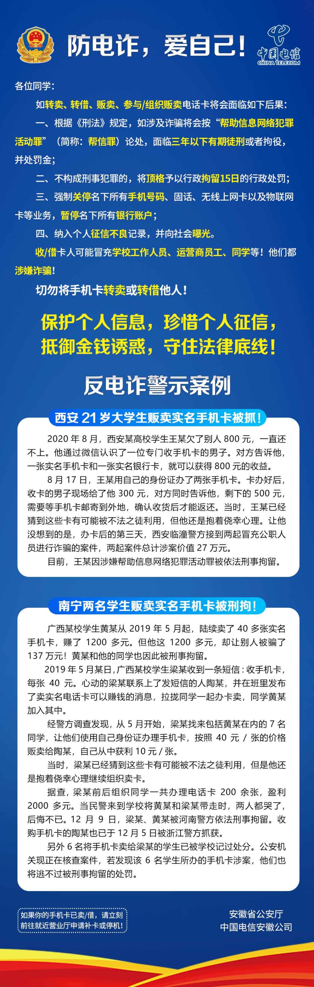 各位同学务必珍爱个人信息,珍惜美好前途,抵御金钱诱惑,守住法律底线!如所办理手机卡已被他人回收,请立刻携带身份证前往就近通讯运营商营业厅处理。