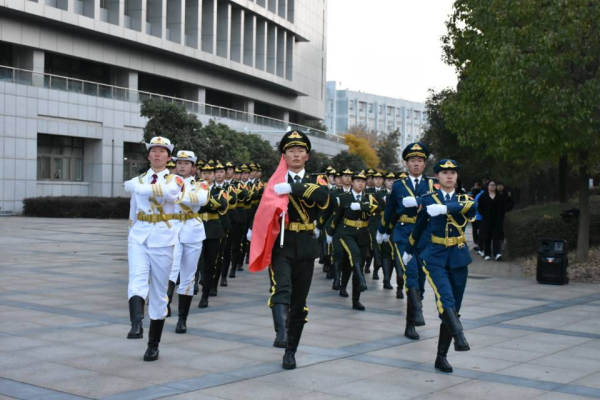 国旗班首先迈着铿锵的步伐护送国旗入场,伴随着庄严的国歌,五星红旗在渐晓的天色中冉冉升起。在场全体人员满怀着对革命先烈的崇敬和对南京大屠杀遇难者的哀思,面向国旗行注目礼。国旗升至顶端停留数秒后,在全体人员的默默注视下降至半旗的位置,旗手脱帽、在场师生静默颔首,共同默哀一分钟。
