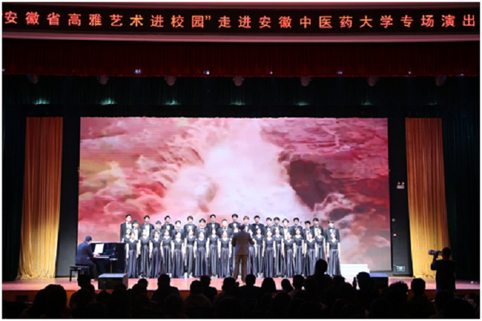 4月25日晚上,演出在安徽中医药大学大学生活动中心举办,安徽中医药大学党委常委、党委宣传部部长吴达武,团委书记叶兰兰、副书记彭程;我校音乐舞蹈学院侯方教授、党总支书记程建、副院长程敏、校团委副书记杨劲及在场数百余名师生共同观看演出。《淮畔杨柳腰》以安徽花鼓灯中风摆柳舞姿为基础,仿佛让人看到一排柳树在风中摇曳生姿;男生独唱《把一切献给党》中坚毅的歌声唱出了在战争中浴血奋战的共产党员的心声;男声三重唱《追寻》用深沉的嗓音唤醒大家心中的热血,激励我们追寻心中的梦想和目标;混声合唱《怒吼吧!黄河》《不忘初心》嘹亮的歌喉,无不充满着对党、对国家的自信。演出精彩不断,热烈的掌声传递了观众们的喜爱与热情。