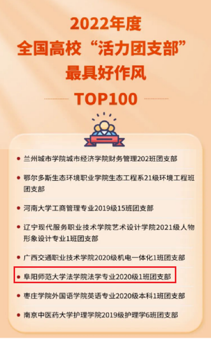 近日,由团中央基层建设部指导,中国青年报社开展的2022年度高校“活力团支部”风采展示活动全国评审落下帷幕,经过校内选拔、校级展示、省级展示、全国展示等环节,我校法学院2020级法学专业1班团支部入选2022年全国高校“活力团支部”最具好作风TOP100榜单。