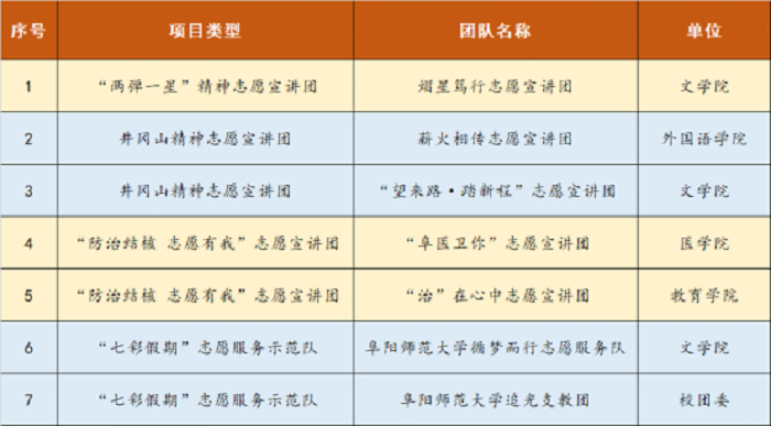 近日,团中央公布2023年全国大学生“两弹一星”精神志愿宣讲团、井冈山精神志愿宣讲团、“防治结核 志愿有我”志愿宣讲团、“七彩假期”志愿服务示范队入选团队名单,我校7支队伍成功入选其中。