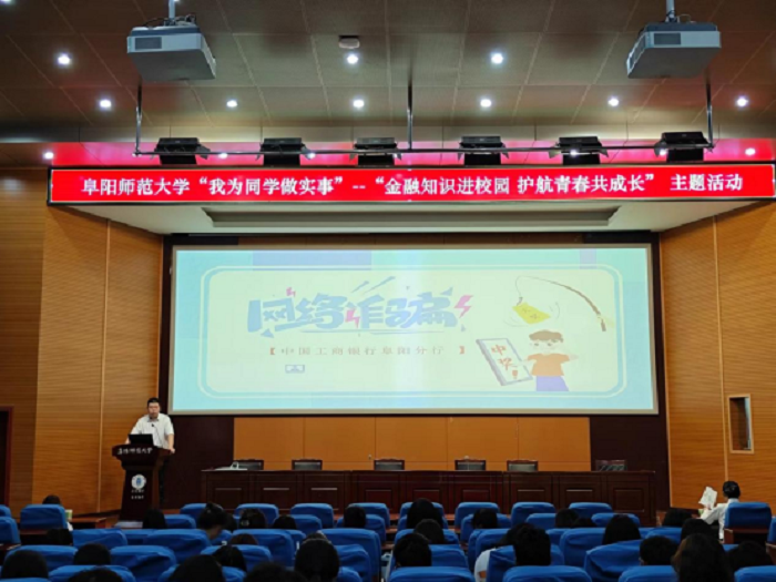 6月9日下午,校团委联合中国工商银行阜阳分行在躬行F楼报告厅举办“金融知识进校园 护航青春共成长”主题讲座,全校200余名学生参加。讲座由中国工商银行阜阳市颍州区支行行长助理周璇主持,客户经理杨益馨主讲。