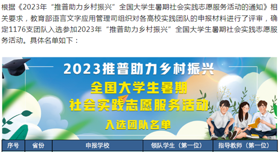 近日,教育部语言文字应用管理司、共青团中央青年发展部公布了2023年“推普助力乡村振兴”全国大学生暑期社会实践志愿服务团队入选名单,我校文学院、外国语学院、生物与食品工程学院组建的3支志愿服务团队成功入选。