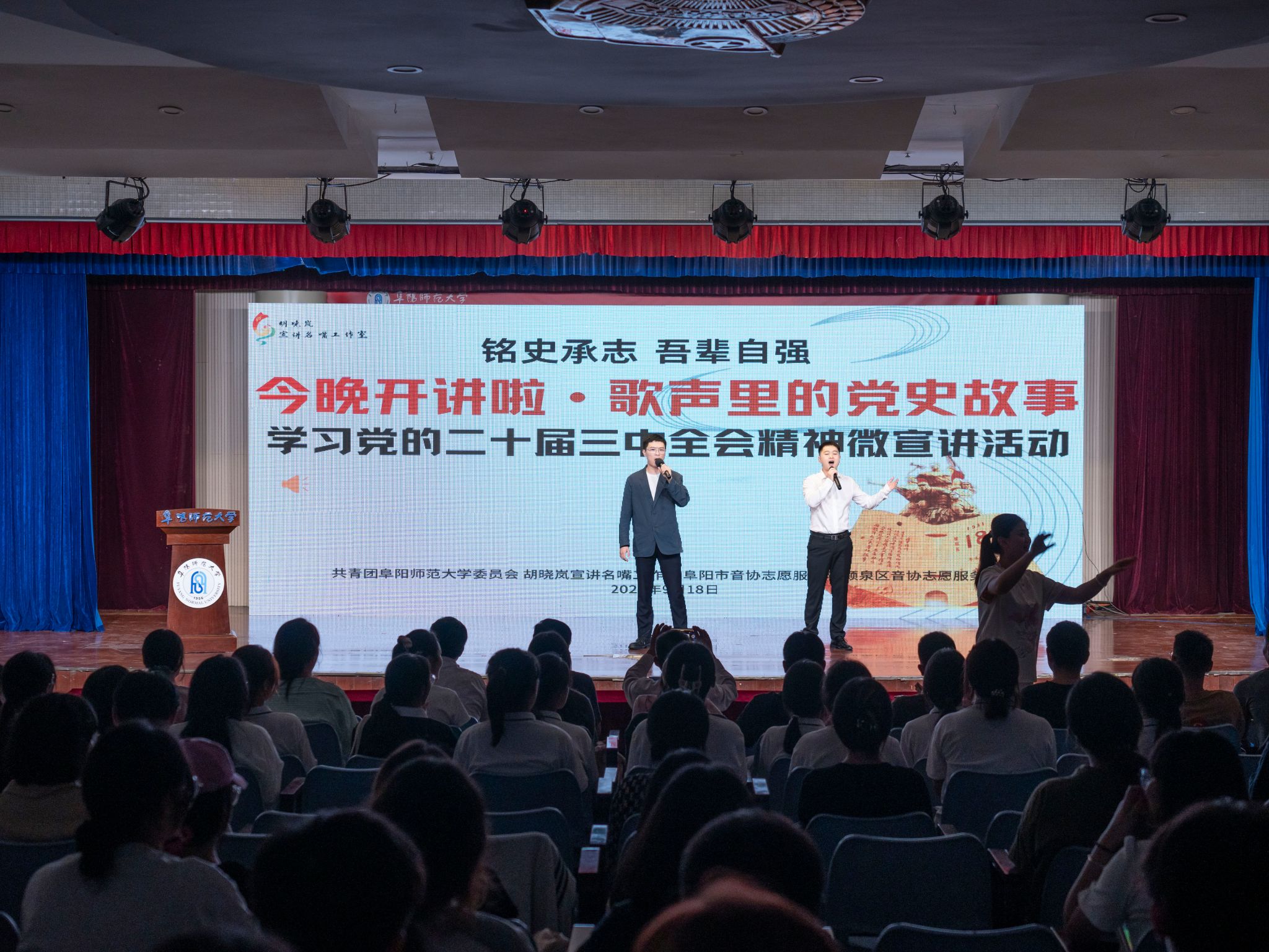 活动邀请了胡晓岚宣讲名嘴工作室、阜阳市音协志愿服务队及颍泉区音协志愿服务队进行宣讲。宣讲团将理论宣讲与文艺宣传融合起来,用音乐打动人心、让理论宣讲“活”起来,内容涵盖“开天辟地”“改天换地”“翻天覆地”“惊天动地”四个篇章。从歌曲《咱们工人有力量》到《在希望的田野上》,从《我的中国心》到《如愿》,同学们在一曲曲悠扬悦耳的红色经典旋律中重温党史、铭记初心、引发情感共鸣。伴随着歌声的余音,宣讲员在每段音乐表演结束后激情开讲,讲述歌曲背后的党史故事,生动再现了党的奋斗历程,歌颂党的辉煌成就,展现了共产党人的本色初衷、雄心壮志和使命担当,弘扬了伟大的时代精神与民族精神,让在场青年学生“沉浸式”感受一场充满激情和力量的微宣讲。