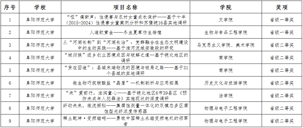 6月10日至12日,由团省委、省教育厅、省科协、省社科院、省学联主办,安徽财经大学、华安证券股份有限公司承办的第十一届“挑战杯・华安证券”安徽省大学生课外学术科技作品竞赛在安徽财经大学举办。我校共有9项作品进入省级决赛,其中,文学院参赛作品《“哑”痛新声:性侵害与农村女童成长保护——基于十年(2015-2024)性侵害女童案例分析和苏豫皖16县实地调研》、生物与食品工程学院参赛作品《人造软黄金——冬虫夏草仿生培植》2项作品获得省级一等奖,《从“河湖长制”到“河湖长治”:党群融合在生态文明建设中的生动实践——基于淮河流域安徽段的研究》等7项作品获得省级二等奖,学校获“优秀组织奖”。相较上一届比赛2项作品进入省级决赛和1项作品获得省级一等奖、1项作品获得省级二等奖,本次入围省级决赛和获得省级一、二等奖的作品数量均有大幅度提高。