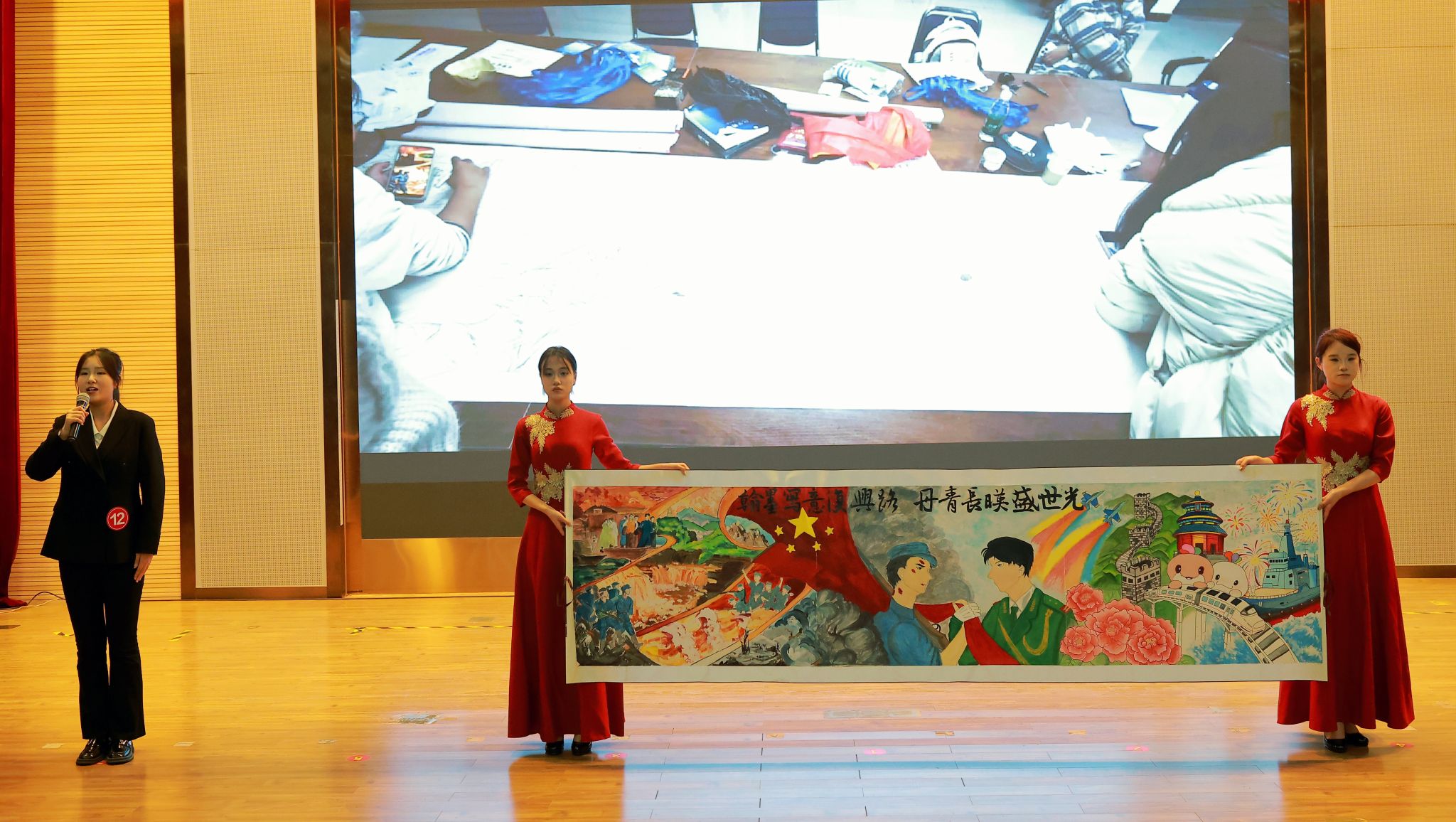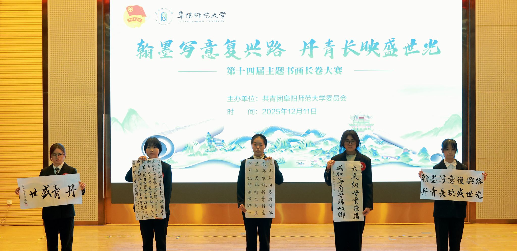 为深入学习贯彻党的二十届四中全会精神,传承中华优秀传统文化,厚植师生家国情怀,12月11日下午,我校在西湖校区正行楼二楼报告厅举办“翰墨写意复兴路 丹青长映盛世光”第十四届主题书画长卷大赛。安徽省高校书法协会阜阳工作站站长姚庆良、安徽省书法协会会员秦予人、江苏省国画院特聘画家李秋风应邀担任本次大赛评委。党委宣传部(党委统战部)、学生工作处、安全管理处、校团委等单位有关负责人、各学院师生代表近400人观看比赛。