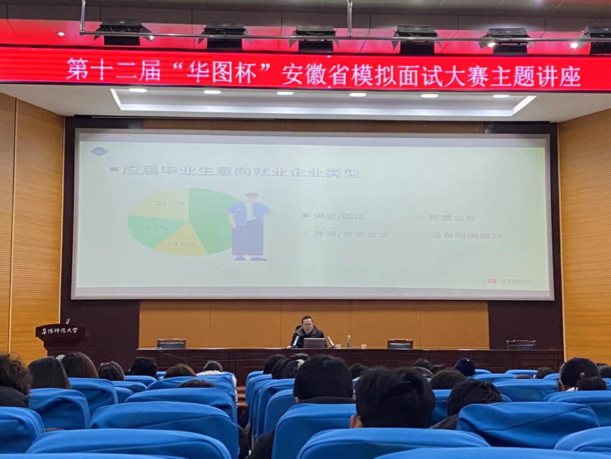 为深入学习贯彻党的二十届四中全会精神,切实提升我校学生面试技巧、增强就业竞争力,12月24日下午,校团委联合安徽华图教育在西湖校区躬行F楼报告厅举办“第十二届‘华图杯’安徽省模拟面试大赛主题讲座——阜阳师范大学专场”活动,华图教育名师张亚东应邀担任本次宣讲会主讲。安徽华图教育阜阳分校副校长赵华鑫、各学院学生代表参加会议。