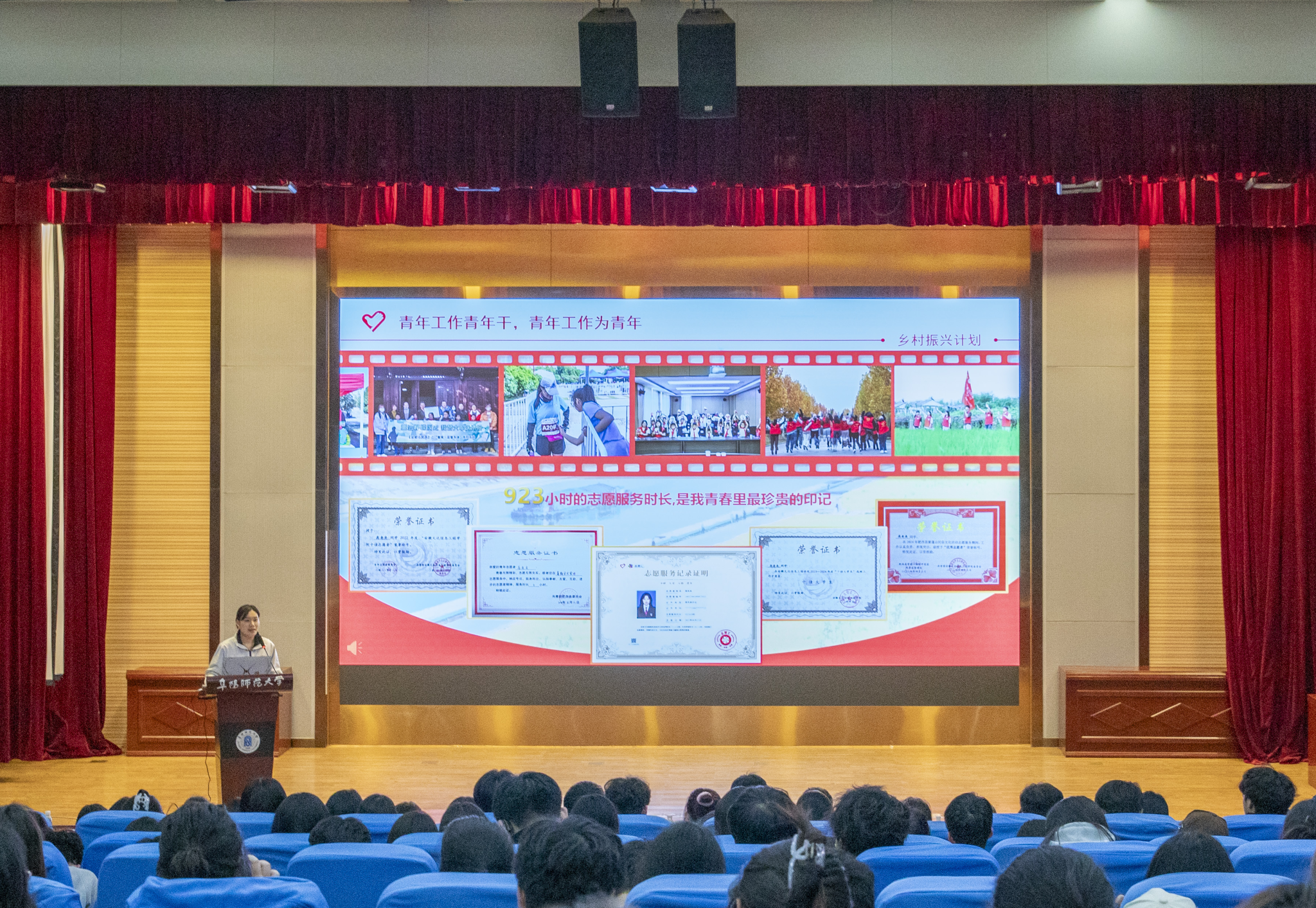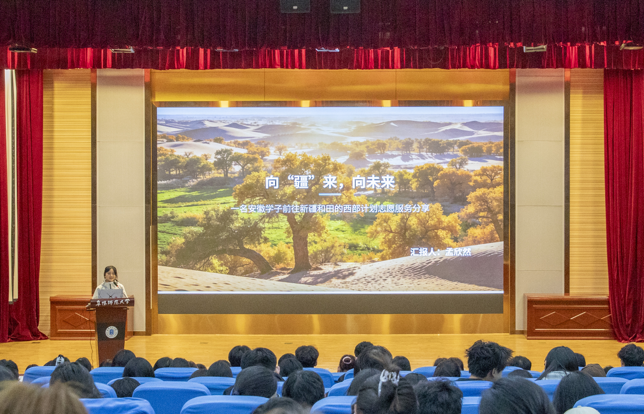 4月12日晚,由共青团安徽省委员会、安徽省教育厅、安徽省财政厅、安徽省人力资源和社会保障厅主办,共青团阜阳师范大学委员会承办的“报效祖国 扎根基层 建功西部”安徽省大学生志愿服务事迹分享会在我校西湖校区正行楼二楼报告厅举行。我校党委副书记孙林华,团省委学校部部长、省学联秘书长邹永生,团省委学校部四级主任科员何苗,校团委书记戴亮出席活动,各学院师生代表共计600余人参加分享会。