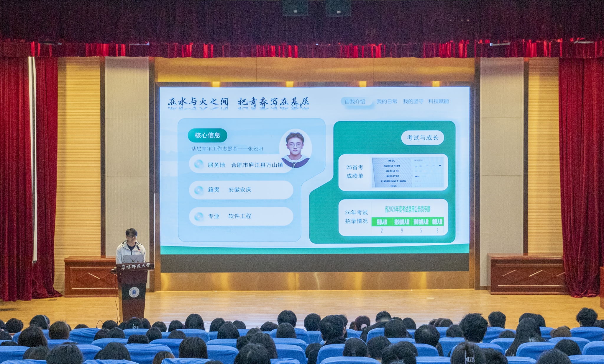 分享会上,何苗详细解读了2026—2027年度大学生志愿服务西部计划和安徽省大学生志愿服务乡村振兴计划的招募政策、服务保障和发展支持等情况,并与现场学生互动交流,耐心解答了同学们关于报名条件、岗位分配、政策待遇等方面的疑问。在志愿者事迹分享环节,张锐阳、高奂奂、方赵一苇、孟欣然、赵添、陶宝凤等6名志愿者代表依次登台,分享了他们在新疆及省内基层服务岗位上的真实经历与成长感悟。他们的志愿服务故事,生动诠释了新时代青年将个人理想融入国家发展大局的责任担当。志愿者们对青春梦想的执着坚守、对国家建设的真情奉献,深深感染了在场师生。
