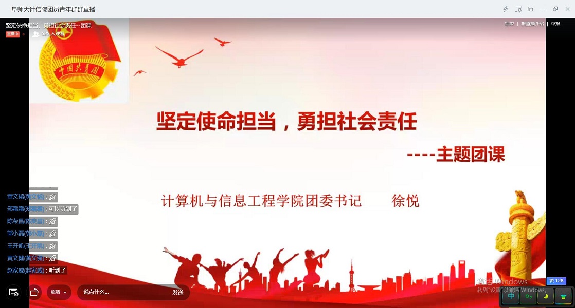 为推动《新时代爱国主义教育实施纲要》的学习宣传贯彻落实,继续深入推进从严治团,加强团员干部的政治性、先进性、群众性以及青年团员的思想政治素质,2020年3月21日,计算机与信息工程学院举办“飞young中国梦,与信仰对话”——“坚定使命担当,勇担社会责任”为主题的线上团课直播。本次团课由该院团委书记徐悦主讲,该院青年团员700余人参加直播学习。