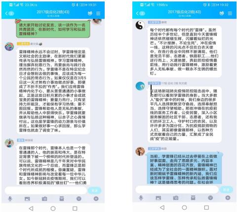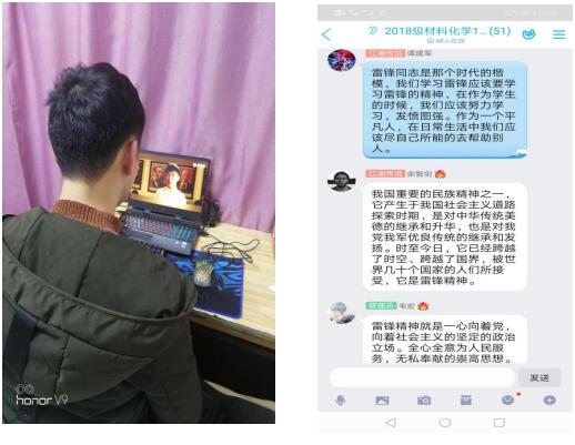 我院各班团支部通过观影、征文、主题团课、实践服务等形式弘扬雷锋精神,传承榜样能量。其中,2017级应用化学2班团支部利用钉钉群开展专题线上主题团课,结合本次新冠肺炎疫情防控工作阐述雷锋精神的时代价值与实践意义,同时针对“作为一名共青团员,在新时代如何学习和弘扬雷锋精神?”进行了深入探讨。2018级材料化学1班团支部通过线上组织观看影片《雷锋的微笑》,带领大家共同回顾青年雷锋的成长历程,之后全体团员依次分享心得感悟,让雷锋精神在传承中熠熠生辉。