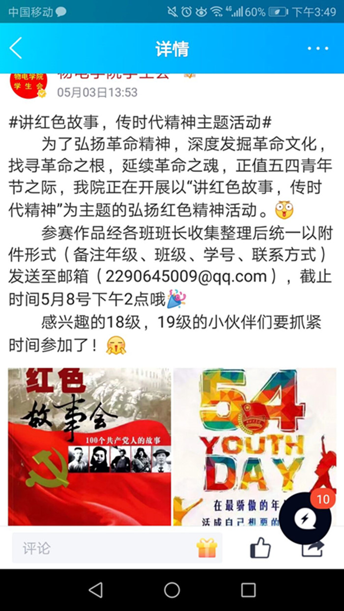 为了传承并弘扬革命先辈的伟大精神,该院于5月1日-5月8日举办“讲红色故事,传时代精神”活动,活动由院学生会学习部和各班班委共同宣传。征集的原创作品主题鲜明,内容健康向上,很好地反映出当今社会的时代精神。