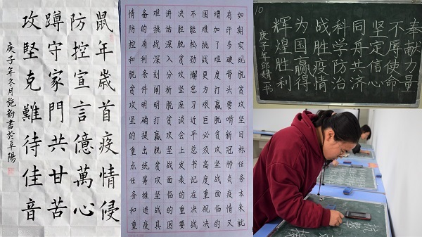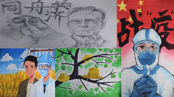 比赛分为绘画组、毛笔组、硬笔组和粉笔组,选手们需在规定时间内完成创作。绘画组的比赛先行开始,有选手执起画笔,勾勒伟大抗疫战士,彰显英雄的责任担当;也有同学以全国脱贫攻坚战的盛况,来歌颂祖国繁荣富强。