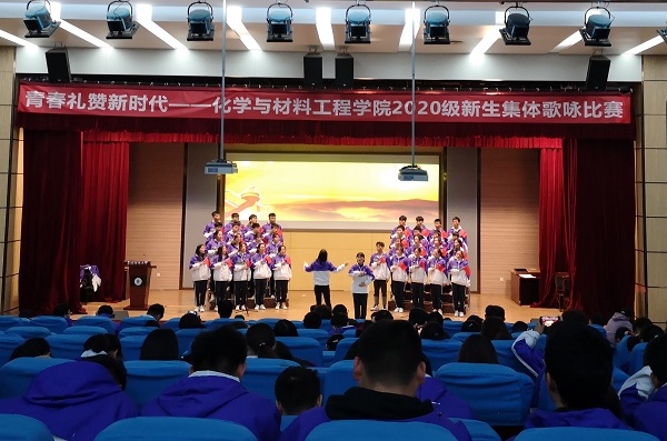 为深入贯彻落实《新时代爱国主义教育实施纲要》,大力弘扬社会主义核心价值观,激发广大青年学子的爱国爱校热情,2020年11月21日,化学与材料工程学院在西湖校区正行楼报告厅举办以“青春礼赞新时代”为主题的2020级新生集体红歌歌咏比赛。学院党委书记马健,以及辅导员刘静、曹婷、董淳一、王艳丽出席并担任本次比赛评委。