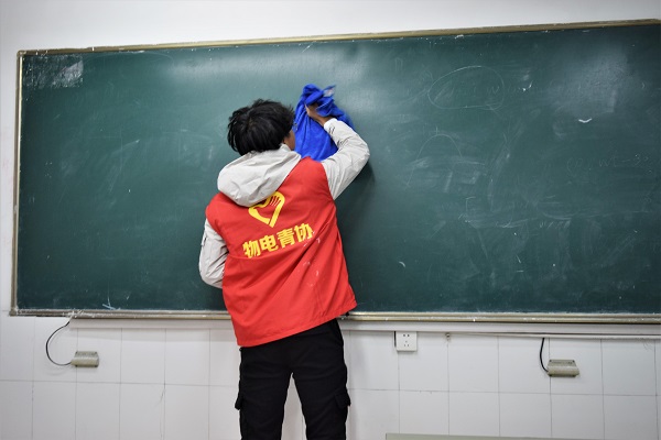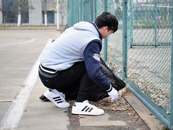 活动开始前,志愿者们被分成八个小组,在图书馆前站队集合。在分发完清扫校园所需要的工具后,协助人员带领同学们前往第一、二生活区的不同地点进行清扫。在接下来的一段时间里,无论是教室、楼梯,还是操场和宿舍楼附近,都有该院学子积极劳动的身影。他们相互配合,相互帮助,有的在教学楼宇拐角处、树林等地捡垃圾,有的在教室忙着扫地和拖地,还有的负责整理堆放着的杂物。经过一番辛勤的劳动,教室的黑板、粉笔槽、地面干净如新。天气寒冷,同学们用劳动热情和责任担当,展现了青年学生不怕苦、不怕累的精神。