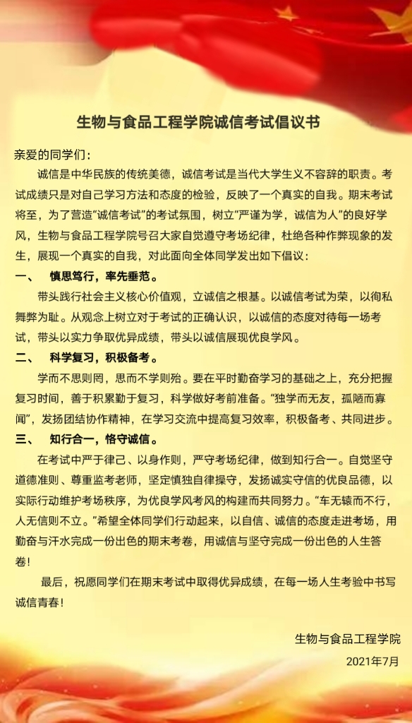 生物与食品工程学院通过一系列举措,引导学生认识到诚信考试的重要性,学生纷纷表示,作为新时代青年大学生,要将诚实守信的传统美德发扬光大,共同营造优良学风考风,交出一份合格的诚信答卷。