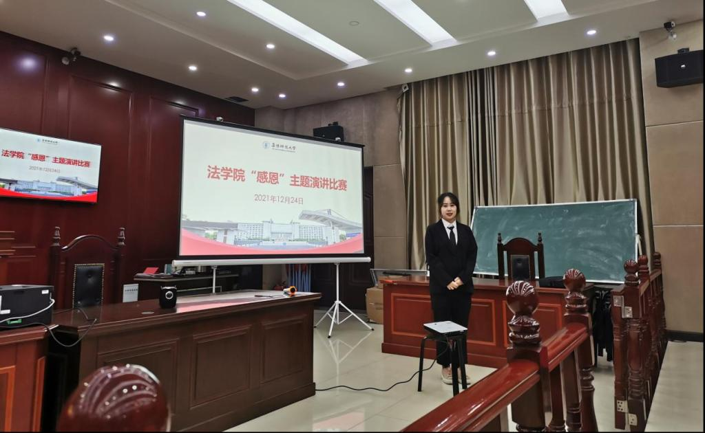 为深入宣传党和国家的学生资助政策,激发广大受助学生勤奋学习、积极进取、全面发展、勇攀高峰的热情,培育受助学生感恩国家、感恩社会、感恩他人的情怀,营造充满活力和健康向上的校园文化氛围。法学院于2021年12月24日在模拟法庭开展“感恩”主题演讲活动。法学院资助工作负责人王楠、辅导员胡五木、兼职辅导员项亚萍以及学生代表30人参加。