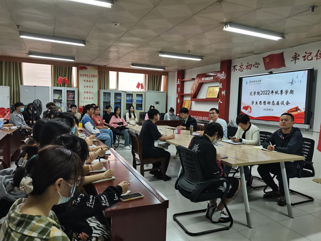 为及时了解学生新学期思想动态,关注学生困难与需求,不断做好思想政治教育工作,文学院于8月30日下午召开了2022年秋季学生思想动态座谈会。文学院党委书记陈旭阳、党委副书记徐春婷、团委负责人、专职辅导员和各班级学生干部代表参会。