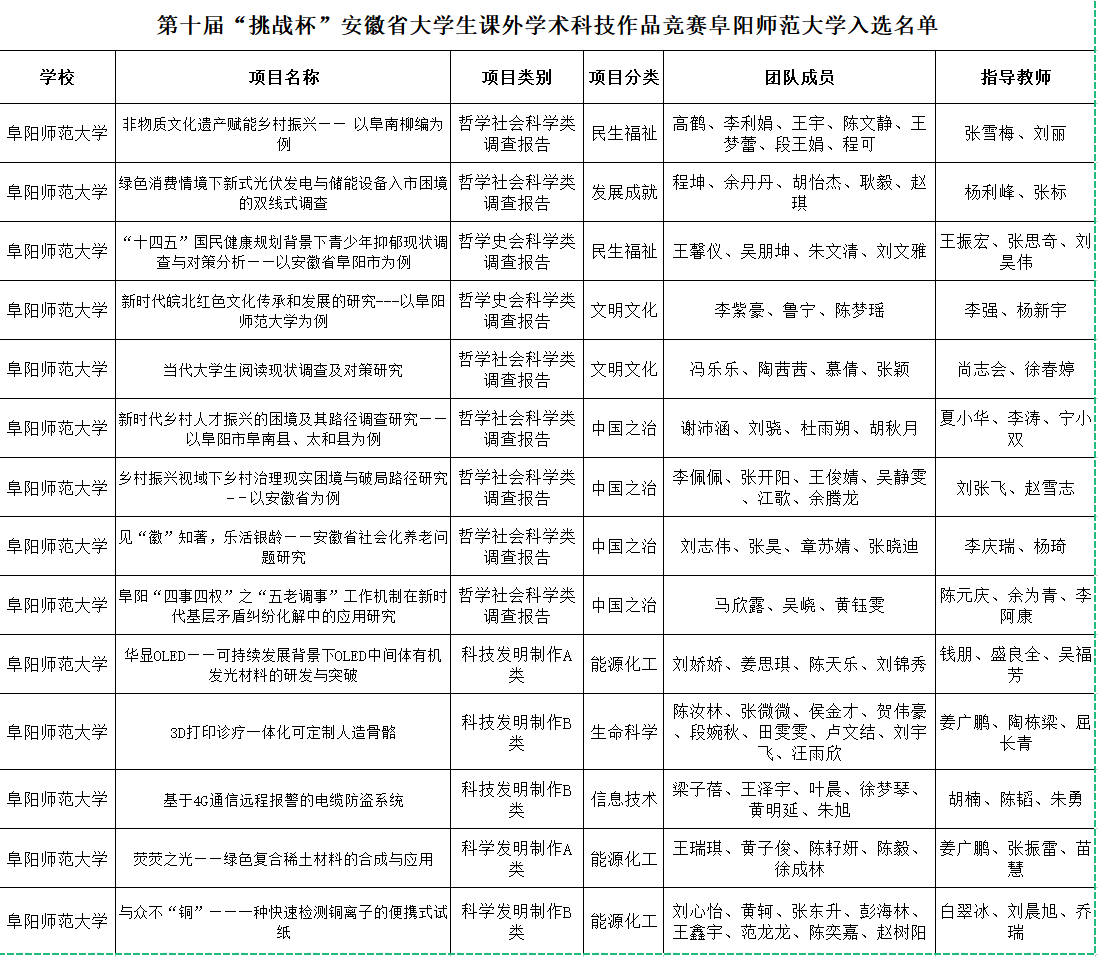 根据《关于举办第十届“挑战杯·华安证券”安徽省大学生课外学术科技作品竞赛的通知》等文件精神,经2023年4月6日专家组评审,拟推荐“非物质文化遗产赋能乡村振兴—— 以阜南柳编为例”等14组作品参加第十届“挑战杯·华安证券”安徽省大学生课外学术科技作品竞赛。公示时间2023年4月7日—4月13日。