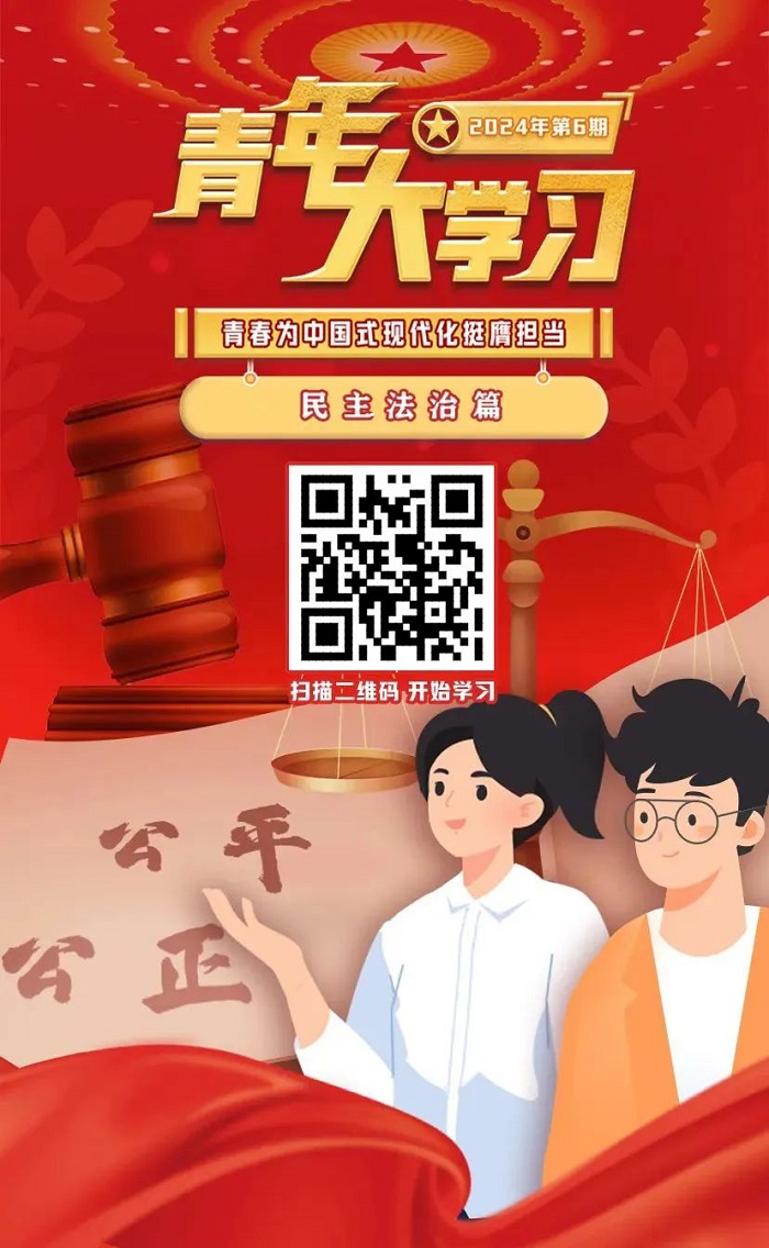 “青年大学习”课程上新了!本周,我们一起来学习2024年第6期,本周“青年大学习”主题为:“青春为中国式现代化挺膺担当(民主法治篇)”。请大家积极动员本本系统、本学院各班级青年参与学习。我们将持续加强对“青年大学习”工作的督导力度。
